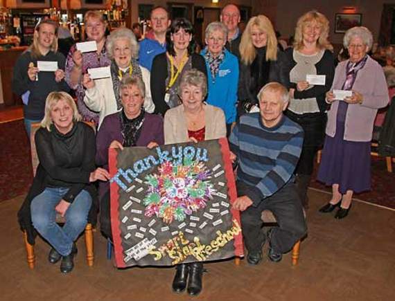 From the front left of the photo are Golda Heywood, Kath Dymond, Jennie Bailey and Donald Stone with local charity representatives, who each received £100 for their charity.