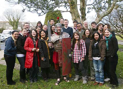 Pastor David Flanders' one man drama 'Surely...' had an international audience on Good Friday as 20 students from Cambridge University attended the service at Soul's Harbour Church, Camelford. The students, who were a group on holiday in the area were from China, Peru, Canada, Syria, Portugal, Italy, Colombia, India, Poland and Japan. They were thrilled with the drama, written and performed by Rev Flanders, in which the Roman Soldier who crucified Jesus tells his story. The armour was made by Terry English who has been in the news recently for making the armour for Liam Neeson in 'Clash of the Titans.'