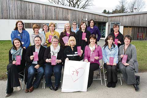 Called the 'J9' project it originated in Cornwall after Janine Mundy, the mother of two boys, was murdered by her husband in 2003. Wanting to prevent this happening again, with the help of the Police Crime Support Department, her family made a video showing the impact of domestic murder. It included a photo of Janine's headstone which has J9 carved on it, and in 2008 the police created a logo for the project: a pink heart with J9 (her nickname) printed on it.