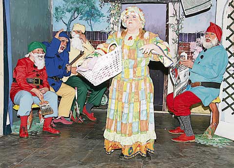 RIOT ACT: Mrs Slop (Carol Francis) is pictured above, reading the riot act to the garden gnomes, from left: Shirley Sargeant (Sulky), Roger Toy (Slumbo), Iain Bruce (Silly) and Allan Sargeant (Snobby).