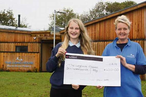 JASMINE Stevens from Sutcombe presents cheque for £600 to Jenny Richardson for the Long House Appeal at Holsworthy.
