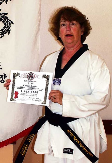 However, this was very special grading for Mrs Kathy Grange as she was attempting 1st Dan black belt at the age of 56 and after 18 years of training in Kukkiwon (WTF) style Tae Kwon Do.