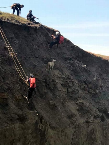 The dramatic rescue saw a team of specially trained RSPCA rope rescue officers carefully lift the lamb back to safety.