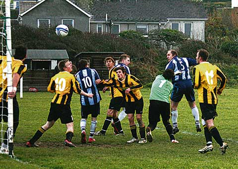 WINNING GOAL: Tim Lyle, second from right, heads the winner for Boscastle first team in their 4-3 victory at home to Looe.