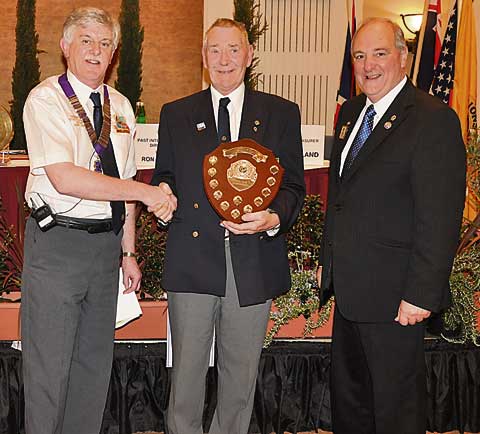 Lion President Ray Perryman is pictured above being presented with the trophy by Past International Director Ron Luxton from New Zealand and being congratulated by District Governor Graham Lang from Looe.