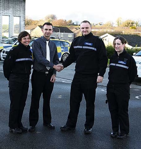 GOOD LUCK TO MATT: Giving their farewell wishes to Matt, from left, are: WPC Nicky Lawson, PC Matt Kingdon, Sgt Aaron Ward and PCSO Laura Smith.