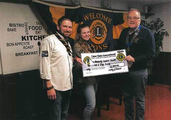 THE Holsworthy Lions presented a cheque for £260 to Holsworthy Explorer Scouts. This is to go towards some new hi-vis vests. Pictured receiving the cheque from president Peter Brown are Mark Sleep and Hanna Steadman.