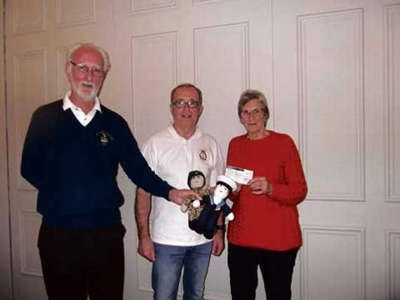 A presentation was made to Margaret Horswill representing Childrens’ Hospice South West. Following an independent auction at the Trafalgar Night Dinner for ‘Jack and Royal’ knitted dolls — both of which are now preserved as the annual charitable donation — this year amounted to just over £233.