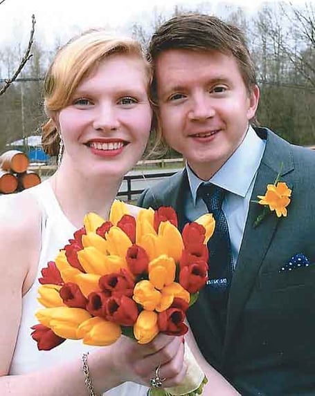 The bride wore a local, designer-made, Grecian-style wedding dress. She carried a bouquet of red and yellow tulips. The bridegroom wore a grey suit and a yellow daffodil buttonhole.