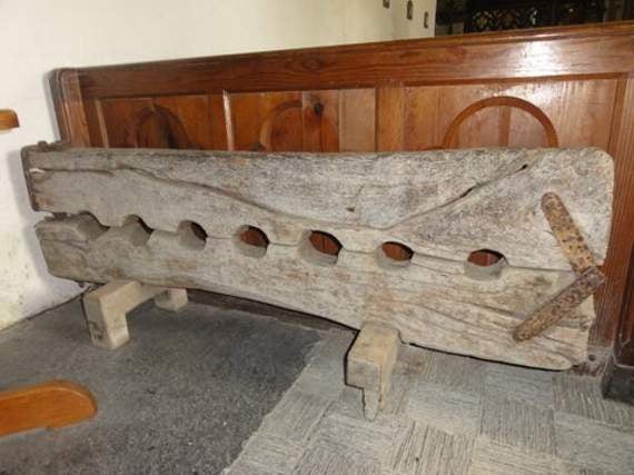 Stocks with seven leg (or arm) holes have been situated in the church for many years but with no explanation for the odd number.