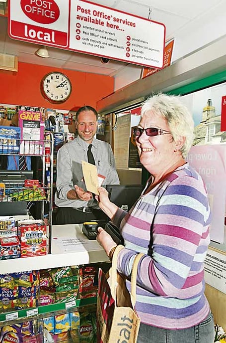 Postmaster Mick Wyatt is pictured above, helping one of the first customers, Gill Goward, the wife of former Tintagel Postmaster, Mick.