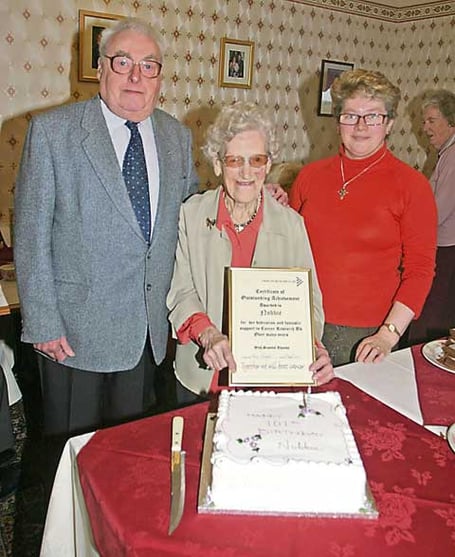 locally as 'Nobbie' celebrated her 101st birthday at the Wyvern Hotel, Bude, on Wednesday, March 11 with her 'Thursday Trippers,' who held a celebration coffee morning. During the celebrations Ray Shaddick, chairman of the Bude branch of Cancer Research UK, presented Nobbie with a certificate and a badge as a thank you for all her support to the charity over the years. Nobbie celebrated her actual birthday on March 12 with a celebration meal at the Falcon Hotel in the town with close friends.