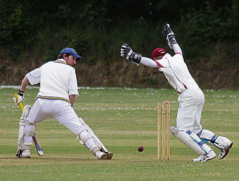 LAUNCESTON'S Ian Searle can only look as the ball bounces back after hitting his leg stump. Penzance wicketkeeper Cas James, shows his delight as this was the breakthrough they were looking for as Launceston's opening partnership had added 84 runs. Launceston were all out for 184.
