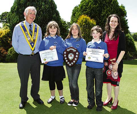 JUNIOR YOUTH SPEAKS:President of Camelford Rotary Club, Bill Dixon, is pictured with the winning team, Otterham Primary School, from left: Annalisa Jernquist, Sadie Lavender-Bourness, Jamie Quinn and Ruth Proudfoot-Smith (teacher). Below, Bill lines up with the joint second place team from Tintagel Primary School, Sam Lowles, Sophie Lowles, Kitty Whitehead and Peter Doman (teaching assistant).