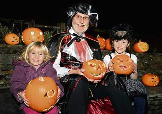 At the parade of pumpkins at Enfield Park, Camelford town mayor Rob Rotchell with the winning pumpkin entrants. 1st place was Joey Edwards (not present) with pumpkin held by the mayor, 2nd place was Chloe Pattenden (right) and 3rd place was Lizzie Cann (left) both holding their winning pumpkins. Thirty pumpkins were entered. The entertainment also included apple bobbing and a ‘touchy feely’ game including witches tongues!