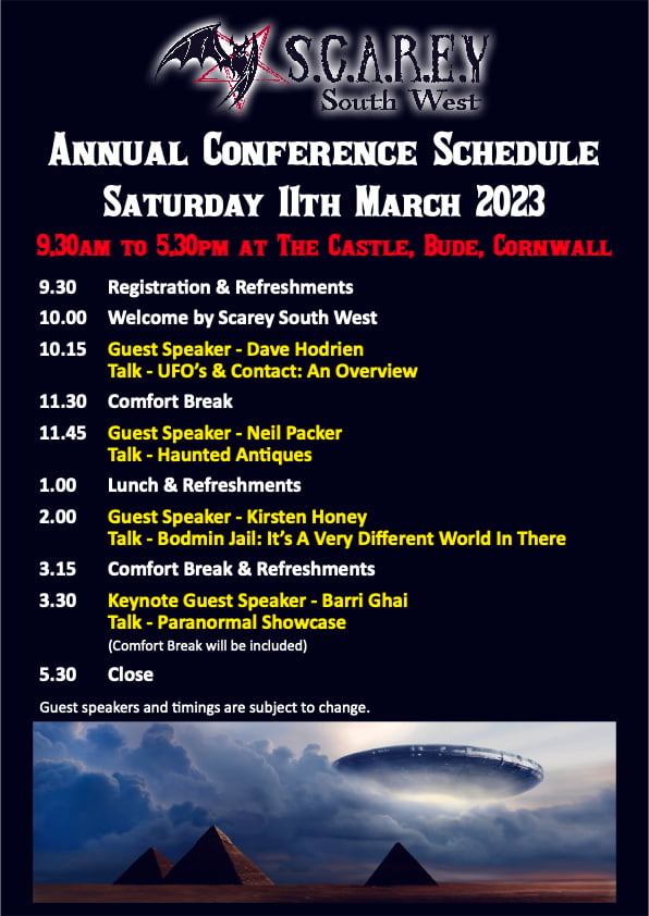 Tickets can be bought from Eventbrite following this link – https://www.eventbrite.co.uk/e/scarey-south-west-annual-conference-talks-on-the-paranormal-and-unusual-tickets-472194716107