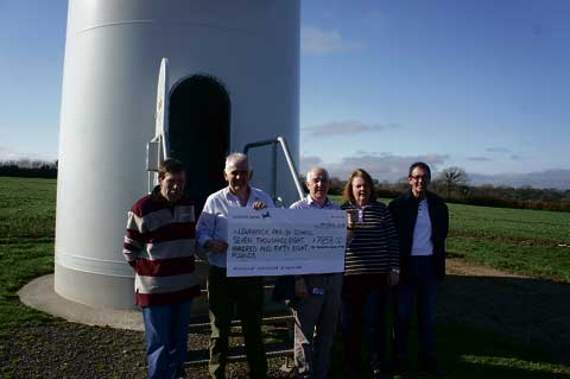 Pictured above are Michael White, vice chair of Lewannick Parish Council and wind turbine committee member; Mr Scott presenting a cheque to Paul Atkinson, chair of Lewannick Parish Council and wind turbine committee member together with Joy White and Stewart Quick — members of the wind turbine grant funding committee.
