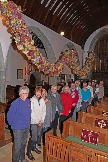 All the flowers for the garland were grown by parishioners — thousands of them were grown in many gardens around the parish and duly gathered in the autumn to be hung to dry ready for the garland’s assembly last Wednesday, November 25.
