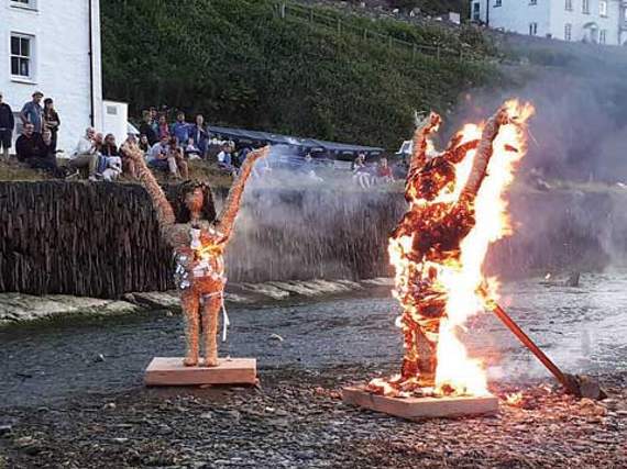 The God and Goddess sculptures were moved into the harbour area. Fires were lit around them and fire dancers then communed with the elements in the beautiful amphitheatre that is Boscastle Harbour. The God and Goddess were set alight. The spectators looked on as the God’s fire raged, the Goddess took longer to burn. By the time the sun set, they were no more.