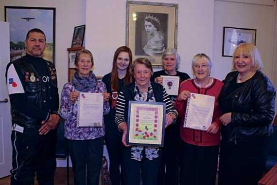 RBL county chairman Steve Lewis, and RBL Cornwall county fundraiser Annie Binding, presented long service awards to Mrs Edna Evely (for 70 years as a collector), Mrs Rosemary Evely (30 years), and Mrs Carole Lee (16 years).