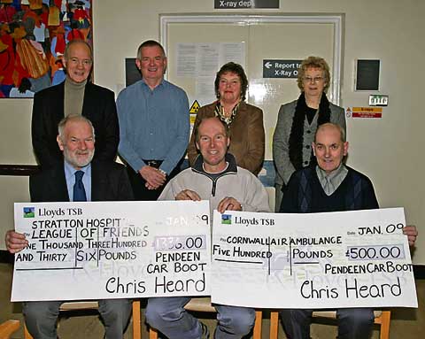 Chris Heard, organiser of the successful Pendeen Car Boot Sales held every Sunday from Easter till November at Stratton, recently presented cheques to Cornwall Air Ambulance and Stratton Hospital League of Friends. The Air Ambulance received £500 and the League of Friends were presented with £1,336, which will go towards the improvement and development of Stratton Hospital. Both Arthur Newton (Cornwall Air Ambulance) and Alan Mill (vice chairman of Stratton Hospital League of Friends) thanked Chris on behalf of their charities for the generous donations and said the money would be a great asset especially to Stratton Hospital who are currently looking for funding for future development and improvement to the building.