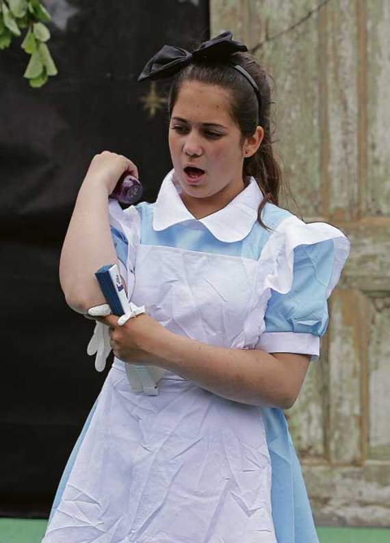 Lewis Carroll, portrayed by Connor, tells the story of Alice, played by Sophie, following Katy the White Rabbit down a hole.