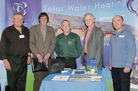 AT THE MASTERCLASS: Pictured, at one of the trade stands, from left: Ron Muckleston (from Camelford), Bill Andrews (from Maxworthy near Launceston), Iain Paterson (Celtic Solar Water Solutions), Lord Tyler and Philip Uglow (from Warbstow).