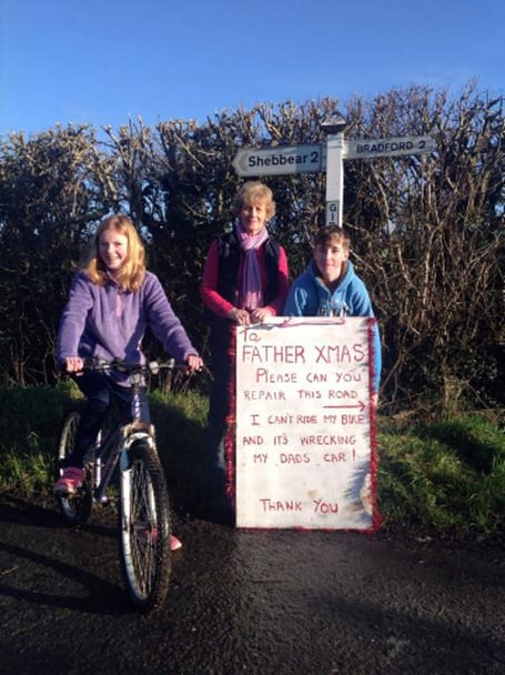 The sign created with the help of Christopher and Rebekah reads: ‘To Father Xmas (sic), Please can you repair this road. I can’t ride my bike and it’s wrecking my dad’s car! Thank you.’