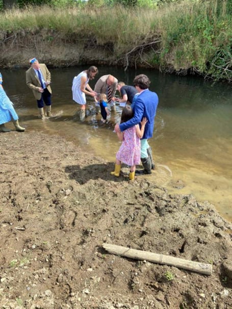 A spokesperson said: “Penelope so much enjoyed the river water as Rev Nicki Farr poured it over her, that she took the shell into her own hands and continued the process. Unfortunately, in spite of using the remains of a box of matches, the baptismal candle failed to light in the river breeze. Carried back up the hill to the farmhouse, it was lit instead in the darkened dining room and placed upon the mantle piece with a closing prayer.