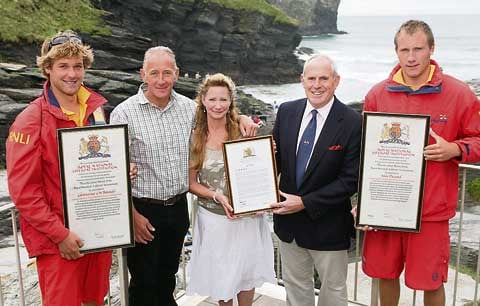 CHRIS Boundy and John Dugard, the first RNLI lifeguards to receive the charity's Silver Medal for Gallantry for saving the life of a sea angler, were presented with a formal record of their medal awards inscribed on Vellum at a low key ceremony at the site of the rescue in Trebarwith recently.