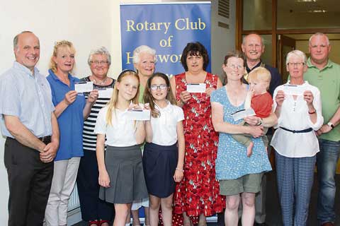 ROTARY member, Robert Cole and president Roger Young present cheques to Jenny Richardson, North Devon Hospice Longhouse Appeal, Celia Sanders HATS, Amelia Wilson and Abbey Brown, Holsworthy Primary School, Heather Knights and Ingrid Bray, Arscott Ladies Choir, Sarah Forsyth, Bradford Preschool and Bridgerule Early Years, Barbara Daniel, Abbeyfield and Tom Mann, Holsworthy Moorland Training.