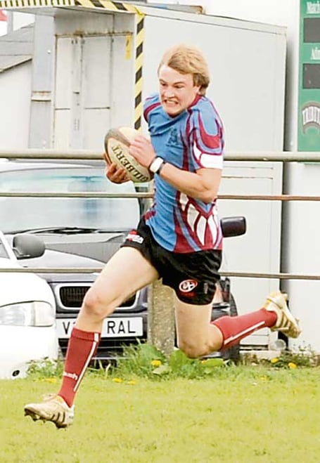 Kyle Speare on his way to scoring a try for Bude in their 45pts to 3 victory over Launceston in the Cornwall Colts Cup final at Hayle.