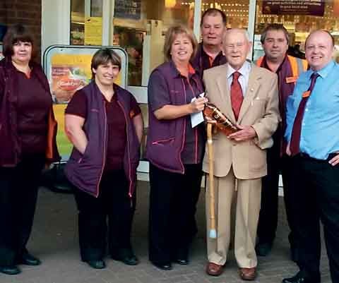Sainsbury's colleagues wished the store's unofficial ambassador, Mr. Elwyn Bowen, a very happy 102nd birthday last Thursday, with a wee dram of his daily medicine! Pictured with Mr. Bowen are Lorraine Jones, PR ambassador, Julie Coombes, Haulwen Griffiths, Steve Bland, David Stewart Walvin, Wayne Ingham, and Ceri Jones, manager.