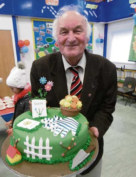 He was then presented with a gift and an apt garden cake by headteacher Sally Gordon, and shared tea, cakes and lots of old stories with staff, parents and pupils past and present.