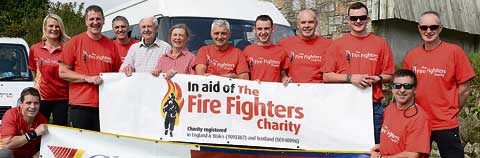 At St Breward, hosts Jon and Joan Webb with the 10 firefighters cycling team from Scotland and their two support vans. Picture: Peter Glaser