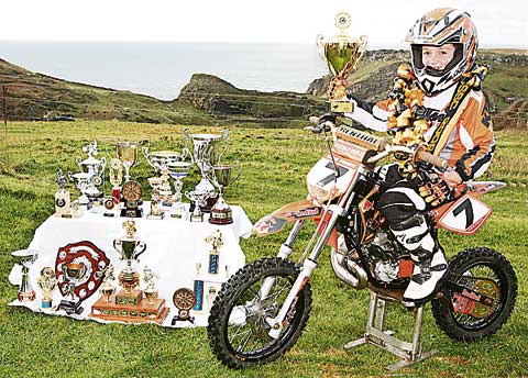 Eight-year-old Dan Roberts from Tintagel has just completed a very successful season in only his second year of motocross racing. Dan is a member of the Cornwall Schoolboy Scramble Club and at their recent presentation evening he won 1st place in the 2008 Summer Series Club Championships for the Auto (50cc) class, 1st place auto aggregate, 2nd place club aggregate and received the club's 'KTM Rider of the Year' award. One of the highlights of the evening was being presented with his trophies by International Motocross Champion, Josh Coppins, who had flown in from New Zealand. Amongst Dan's other achievements this year were 2nd place in the South West Motocross Club's 2008 Summer Series Club Championship, North Cornwall Motorcycle Club's 'Sportsman of the Year' award and many other wins and runner-up positions in two-day events, fun days and evening meetings at Cornwall Schoolboy Scramble Club, South West Motocross Club, South Somerset Motocross Club and some events further afield. As a farewell to his auto racing, Dan will be competing in January at a British Supercross event at the O2 Arena in London, before moving up to the 65cc class for the 2009 season. Dan's family and friends are extremely proud of his achievements this year and wish him all the best for the year ahead.