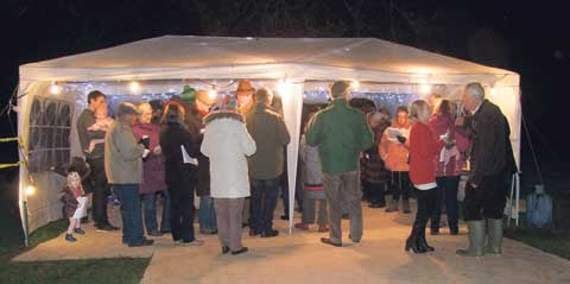 About 70 people tucked into the mince pies and cream, provided by Shelley Vanstone at Tesco. Countryside Furnishers came up trumps by giving some carpet off-cuts to lay on the wet grass.