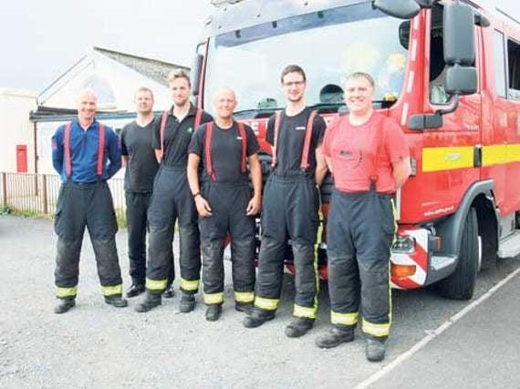 Police and fire community support officer Mark James (far left) and his fire-crew colleagues had been attending a local incident and decided to take the opportunity to call at the village hall and remind local residents about the importance of home security and fire safety checks.
