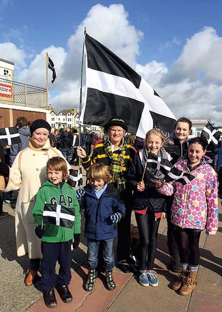 MARCHING ORDER: Around 100 people turned out for the Annual St Piran March at Bude on Sunday. Above, alongside the flag, are, from left, Lindsay Ricketts, Archie Courtnay-Perrott, William Moyle, Angela North, Olivia Moyle, Maisy Jory, and Izzy Nesham. Picture: Paul Hamlyn, Launceston.