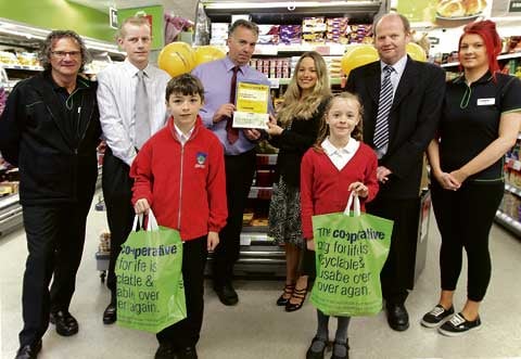 Pictured back row: Co-op staff members Roy Smith and Dan Mathieson, store manager Nick Park, Moor and Coastal Partnership Trust’s co-ordinator Amanda Musgrave, Camelford Primary School headteacher Simon Bishop and Co-op staff member Naomi Lander. Front row:?primary pupils Dan Blackwell and Maia Noon. Picture: David Flower.