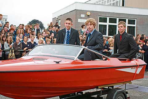 They arrived at the college, dressed in their suits and gowns, in all types of transport which included space hoppers, numerous stretch limos, motorcycles, tractors, and even a fire engine.