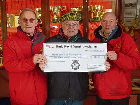 The Bude branch of the Royal Naval Association presented £300 to members of the SLSC, following a recent talk by chairman Adrian (Horace) Parsons.