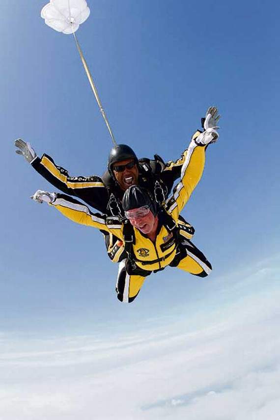 They jumped from 15,000 feet, any higher would require oxygen tanks, and within seconds, they were plummeting downwards at 120mph, in a tandem jump, which is the easiest of all skydives. It requires only 30 minutes of training before jumping, each strapped to a British Parachute Association Tandem Instructor.