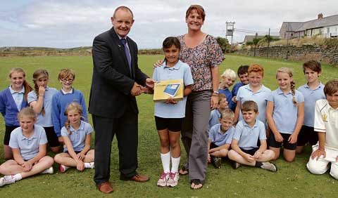 TAMARA Merson from Otterham Primary School is presented with a tablet by Russell Lawrance, acting head of Cornwall College St Austell, joined by Helen Ward, Otterham headteacher. Picture: David Flower