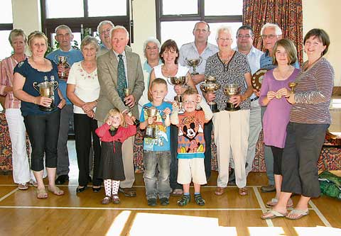 The prize winners were Mandy Mitchell, Margaret Britton, Des Moore, Mr and Mrs Sanders (judges), John Lucas, Jen Gliddon (President), Nicky Mitchell, Steve Mitchell, Myrtle Rooke, Michael Shovelton (Chairman), Jim Rooke, Hilary Pearce and Louise Pearce. Front row, from left: Jade Moon, Nathan Graham and Sam Greenaway.