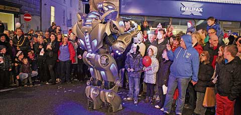 Santa on his sleigh, pulled by members of Launceston Young Farmers' Club who were dressed as reindeers, rode into town leading the procession and a special visit from internationally renowned Titan the Robot wowed the crowds.