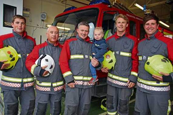 Fourteen-month-old Brandon, and his mum Kirsty, were reunited with the fire crew when they visited Bude Community Fire Station on Monday.