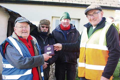 DEREK Jones is presented with a trophy from clerk of the course Bill Rosten for his 50 years’ service marshalling at the Sutcombe Hill section. Picture: Dawn Bewes, Holsworthy