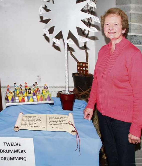 At the church, Camelford on Friday with her ‘Twelve Drummers Drumming’ exhibit is Judith Bennett. Picture: David Flower