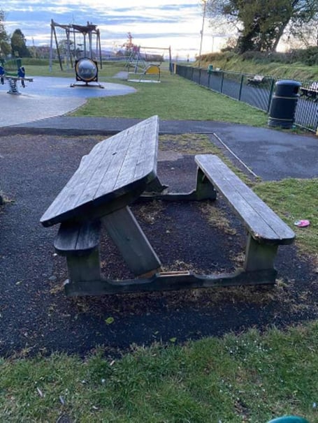 A town council spokesperson said: “Between 6.30pm and 9.30pm, damaged caused to one of our wooden picnic bench in the Play Area of Stanhope Park.